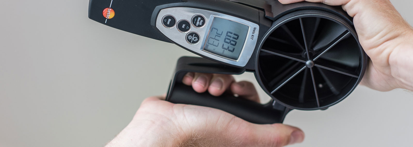 We berekenen altijd het ventilatiedebiet per ruimte. De norm toe of af te voeren lucht is 3,6 m³ lucht per uur en per m² vloeroppervlakte in die ruimte. Per type ruimte zijn ook nog minima en maxima waartussen dat debiet moet liggen. Als ventilatieverslaggever is het onze taak om dat debiet te bepalen voor elke woning en ruimte.